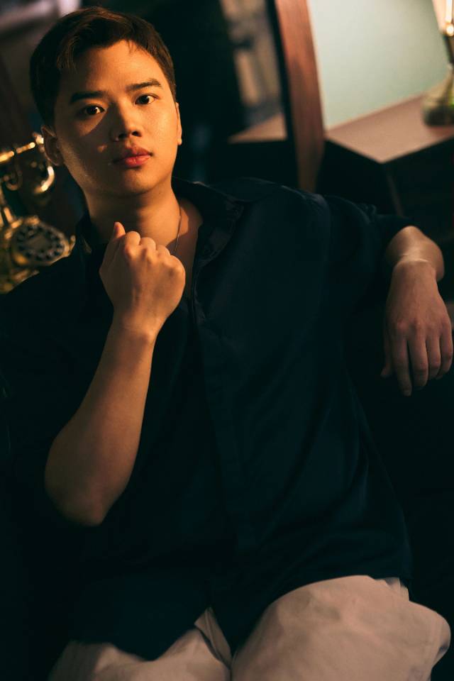 纯黑背景映衬专注神情,红标点缀深沉衣衫,静默中透出思考的力量